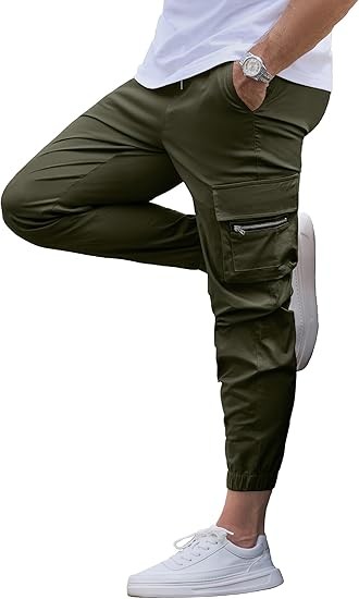 Mens Cargo Jogger Pants Elastic Waist Drawstring Regular with Zipper Pockets Cotton Pants for Men