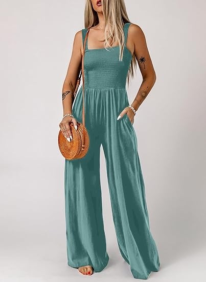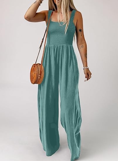 Feature: One Piece Sleeveless Jumpsuits, Square Neck, Wide Leg Pants, Two Side Pockets, Solid Color, Stretchable Long Pants Jumpsuit, Loose Fit, Casual Style.