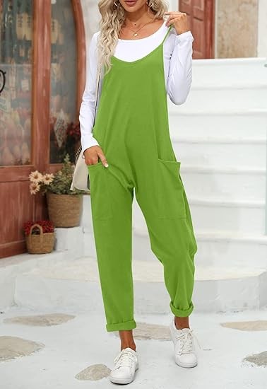 Features: Women sleeveless rompers, with relaxed fit design, solid color, two big side pockets, low crotch, back pocket decoration, long pants jumpsuits, cute and stylish outfits for women