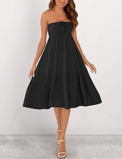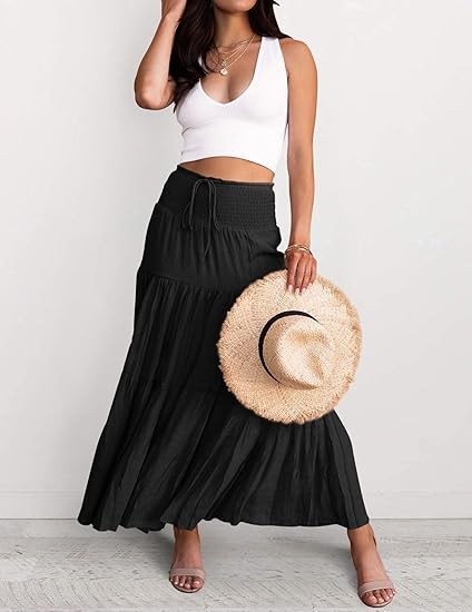 Women's Summer Flowy Boho Maxi Skirt Trendy Drawstring Elastic High Waist Pleated Tiered A Line Beach Long Skirts