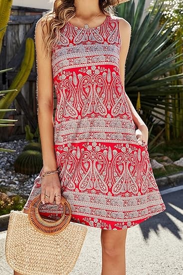 Feature: Summer Dresses for women comes with colorful floral print, round neck casual style,sleeveless,two side pockets which were deep enough to put into cards or lipsticks,Boho style, Swing Hem, sundresses;The bright Colorful print looks shine in summer Occations: T shirt dress is comfy enough to wear around the house as house dresses,work dress for women office,shopping,walking,and wear it to a casual evening out for graduation party,travel,beach wear Season: sun dress for women is above the knees and long enough that you wouldn't need to wear leggings with it if you didn't want.Boho dresses suit for summer or you can also collocate a coat in spring, autumn or winter Match: Cute tank dress great with jewelry,sandals,heels,flip flops or even sneakers.Casual loose swing dress also can look sexy if you pair it with a belt for a night out and paired with a pair of boots will make you looks great.