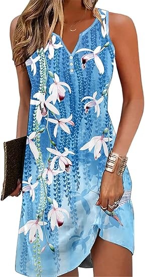 Material: 95%Polyester,5%Spandex.Skin-Friendly,Breathable,Nice and more of a soft stretchy feel.Not see through,Not shrinkage,Lightweight,Ideal for summer weather. Features:This dress features a V-neck,Sleeveless,Floral Print design.The A-line silhouette flatters all body shapes.Ideal for vacation or everyday wear,Is a must-have for the fashion-forward woman. Occasion: Whether you're heading to the beach,A dinner out,Or a casual day of shopping,This dress is versatile enough to suit any occasion.Pair it with sandals for a laid-back look or dress it up with heels and accessories for a more polished ensemble. Attention:Machine or hand wash with cold water/Hang or line dry/No bleach. Please forgive the slight color difference caused by different computer and mobile phone monitor settings.
