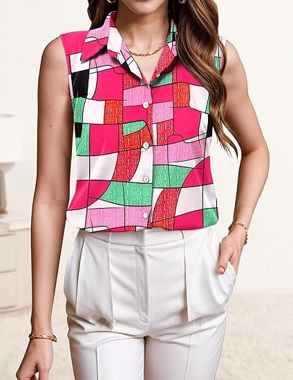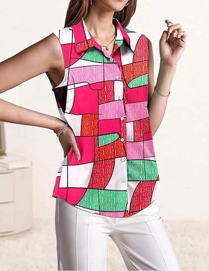 Quality Sleeveless Tops - Crafted from premium fabric 92% polyester and 8%Spandex, soft to the touch, lightweight and comfortable Classic Collared Shirts - Spread collar, button-up front closure, curved hem, clean chest-cut design for adding effortless enhancement to your silhouette and bringing business professional polish to any outfit Versatile Button Down - You can dress down with jeans, shorts,denims for relaxed yet polished casual look or dress up with skirts, slacks or dress pants for a dressy and professional look. Tuck for dressy casual look while untuck for a more business casual look