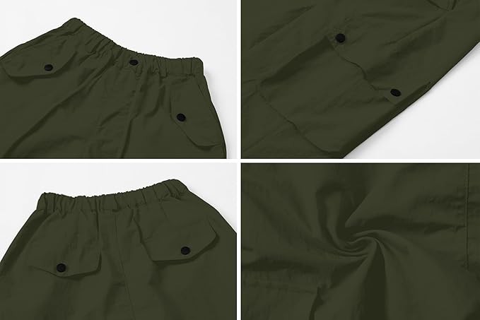 These Parachute Pants are made of soft, lightweight fabric Elastic back waist with drawstring provide comfort and fit Multi pockets for functionally, the strings at your ankle, 1 pair of pants to experience 2 styles of wearing, straight wide leg and loose joggers Light Water resistant helps to wick away moisture and keep dry and cool.