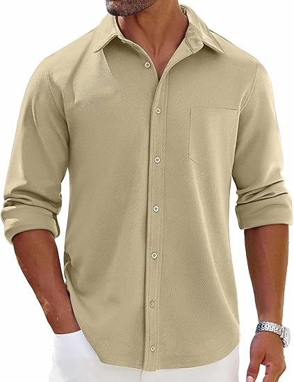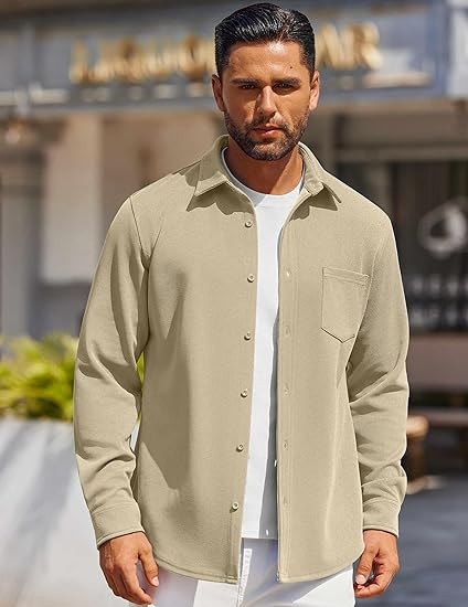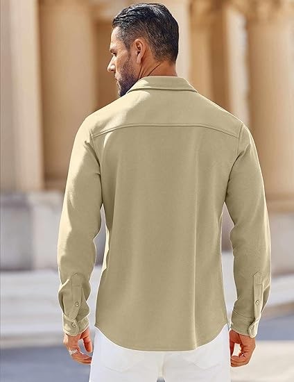 WRINKLE FREE - This mens button-down long sleeve shacket is made of performance knit twill. Four-way stretch, Soft against skin, Sweat-wicking and Naturally breathable, which provides a cozy and warm wearing experience all through autumn and winter. DESIGN - Men's Casual Shirt features long sleeve, spread collar, chest pocket, curved hem. The stitching is flawless, and the buttons on the cuffs add a stylish touch. The well-structured shirt will holds its shape nicely. STYLE - Wear it solo or as a overshirt, showcasing both durability and sophistication. Pair it effortlessly with chinos or jeans for an everyday oufit. Tuck the shirt into tailored trousers and add a belt for a more polished appearance. OCCASION - Mens casual jacket is perfect for casual and smart casual look in spring, autumn, winter. Suitable for casual outings, office wear, date nights, travel, casual fridays, social events, outdoor activities,etc. A perfect gift for your boyfriend, son, husband, or yourself to express your unique thoughtfulness. TIPS - Machine washable. Please refer to our size chart before you order.