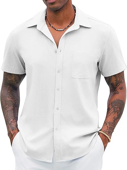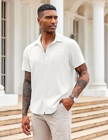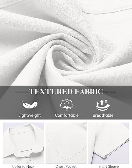 Comfortable Fabric: Mens Button Down Shirts are made from breathable and soft fabric, with a cotton and linen textured surface, but it feels smoother and better drape with slightly elastic, will not easily shrink and wrinkle after washing, making you feel cool all day long Modern Look: The Men's Casual Shirt features spread collar, functional chest pocket, short sleeve, button down closure to provide a comfortable fit, and in solid color with clean details make you look elegant when wearing them. Collocation: Summer Beach Vacation Shirt for men can be paired with shorts, sunglasses for relaxing beach wear in hot weather, and can be paired with trousers, casual canvas shoes, white T-shirts, etc. for travel or outings in all seasons. Occasion: Men's Short Sleeve Shirts for beach weddings, as well as men's shirts for vacations, pool parties, date nights, travel, cruises, family beach photos, dinners, honeymoons, as gifts, business trips, semi-formal offices and more. Warm Tips: Machine wash for Men's Summer Shirt. Please refer to our SIZE CHART for selection