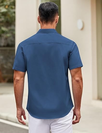 LIGHTWEIGHT AND COMFORT: The COOFANDY Men's Short Sleeve Casual Shirt prioritizes comfort without compromising on style. The inclusion of soft fabric not only ensures a silky feel but also enhances breathability; allowing for a comfortable wearing experience throughout the day MODERN LOOK: Embrace a modern aesthetic with men's short sleeve shirt; the urban design features classic shirt collar; button closure; timeless solid color and a regular fit tailored to complement most body types. This shirt effortlessly combines timeless style with contemporary flair, making it a versatile addition to your wardrobe EASY TO MATCH: A new fit for COOFANDY, Relax it's summer you have earned it; Whether paired with chinos or jeans for casual wear or dressed up with formal pants for special occasions, this shirt effortlessly adapts to your style, offering flexibility for a range of outfit choices MULTIPLE OCCASIONS: This men's casual dress shirt is suitable for a variety of occasions; From weddings and date nights to business meetings and daily casual wear, it effortlessly transitions between different settings; Versatility is key, making it an ideal choice whether worn alone or as a base layer for additional styling options WARM TIPS: Machine washable for Mens Button Up Shirt. The convenience of easy care adds to the overall appeal of this exceptional garment. Please refer to our size chart carefully before you order