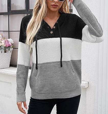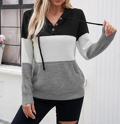 For an oversized look, choose your normal size; for a fitted look, choose one size smaller. Please consult the size chart before placing your order to ensure the best fit. Model is wearing size S and is 5'9'' tall, BWH: 33.8'', 24.8'', 36.2''. S=4-6, M=8-10, L=12-14, XL=16-18. Fall Oversized Hoodies: Wear this cozy trendy sweater hoodie with three buttons that you can open or close as needed. The cuffs and hem are designed with elastic ribbed patterns, adding a sense of fashion and fit. Knitted Long Sleeve Sweatshirts: Comfy drawstring hoodie with a kangaroo pocket is a classic design that gives you a casual style. It is also convenient to carry things like phone or keys and keep your hands warm.