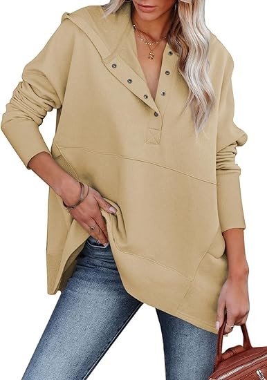 Material: 95% Polyester + 5% Elastane; This trendy cute hoodie top is made of soft and skin-friendly fabric, comfy and comfortable, providing you with a loose and cozy wearing experience. Features: This trendy hoodie sweatshirt for women features long sleeves, a button-down V-neck, a large kangaroo pocket, and an oversized design for a relaxed and baggy appearance. The cuffs, hem, and pocket edges are ribbed for ample elasticity, offering a superior wearing experience suitable for any body type. It's a great addition to your wardrobe. Match:Loose-fitting hoodie tops effortlessly complement various casual bottoms like leggings, pants, jeans, joggers, and shorts, when paired with sneakers or casual shoes, to achieve a stylish and chic appearance during the spring, fall, and winter seasons. Wearing it creates the most beautiful and stylish look. Occasion:This pullover sweatshirt is Perfect for daily, home, school, shopping, going out, club, night out, holiday, weekend, vacation, office, work, date, streetwear, etc.It's also a good gift to your friend or family in spring,fall and winter.