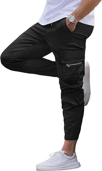 Mens Cargo Jogger Pants Elastic Waist Drawstring Regular with Zipper Pockets Cotton Pants for Men