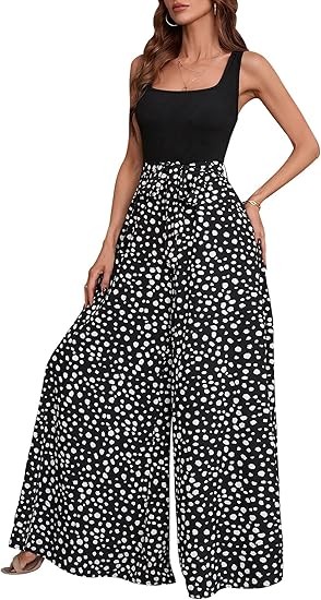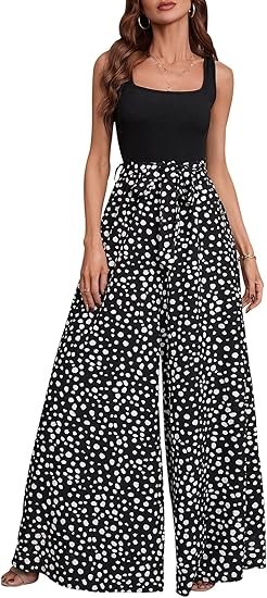 Material:Polyester and spandex.Well made,comfortable fabric.Casual comfy as pajama pants,lightweight and breathable. Design:Dalmatian print,colorblock,sleeveless,square neck,wide leg,empire waist,tank top jumpsuit,with belt,loose and casual style will be your best choice in summer! Occasion:The tank top jumpsuits for women are perfect for spring,summer,fall,going out,beach,vacation,shopping,homeware,date,yoga,party,club,garden party,wedding,cocktail,honeymoon,work,any outdoor or indoor activities. Match:You can pair this color block wide leg pants with variety of shirts,blouses,tunics,sandals,sneakers or heels to complete casual look that's easy to love all season long to show your curves and flatter your body.