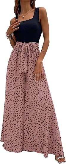 Material:Polyester and spandex.Well made,comfortable fabric.Casual comfy as pajama pants,lightweight and breathable. Design:Dalmatian print,colorblock,sleeveless,square neck,wide leg,empire waist,tank top jumpsuit,with belt,loose and casual style will be your best choice in summer! Occasion:The tank top jumpsuits for women are perfect for spring,summer,fall,going out,beach,vacation,shopping,homeware,date,yoga,party,club,garden party,wedding,cocktail,honeymoon,work,any outdoor or indoor activities. Match:You can pair this color block wide leg pants with variety of shirts,blouses,tunics,sandals,sneakers or heels to complete casual look that's easy to love all season long to show your curves and flatter your body.
