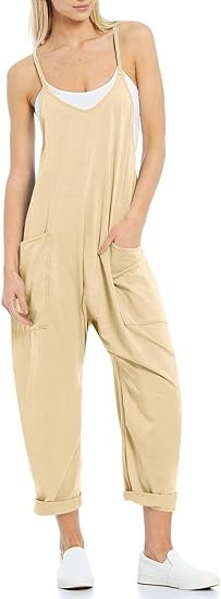 Features: Women sleeveless rompers, with relaxed fit design, solid color, two big side pockets, low crotch, back pocket decoration, long pants jumpsuits, cute and stylish outfits for women
