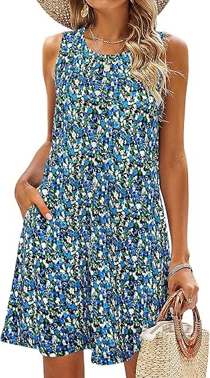 Feature: Summer Dresses for women comes with colorful floral print, round neck casual style,sleeveless,two side pockets which were deep enough to put into cards or lipsticks,Boho style, Swing Hem, sundresses;The bright Colorful print looks shine in summer Occations: T shirt dress is comfy enough to wear around the house as house dresses,work dress for women office,shopping,walking,and wear it to a casual evening out for graduation party,travel,beach wear Season: sun dress for women is above the knees and long enough that you wouldn't need to wear leggings with it if you didn't want.Boho dresses suit for summer or you can also collocate a coat in spring, autumn or winter Match: Cute tank dress great with jewelry,sandals,heels,flip flops or even sneakers.Casual loose swing dress also can look sexy if you pair it with a belt for a night out and paired with a pair of boots will make you looks great.