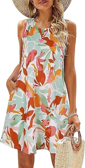 Feature: Summer Dresses for women comes with colorful floral print, round neck casual style,sleeveless,two side pockets which were deep enough to put into cards or lipsticks,Boho style, Swing Hem, sundresses;The bright Colorful print looks shine in summer Occations: T shirt dress is comfy enough to wear around the house as house dresses,work dress for women office,shopping,walking,and wear it to a casual evening out for graduation party,travel,beach wear Season: sun dress for women is above the knees and long enough that you wouldn't need to wear leggings with it if you didn't want.Boho dresses suit for summer or you can also collocate a coat in spring, autumn or winter Match: Cute tank dress great with jewelry,sandals,heels,flip flops or even sneakers.Casual loose swing dress also can look sexy if you pair it with a belt for a night out and paired with a pair of boots will make you looks great.