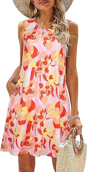 Feature: Summer Dresses for women comes with colorful floral print, round neck casual style,sleeveless,two side pockets which were deep enough to put into cards or lipsticks,Boho style, Swing Hem, sundresses;The bright Colorful print looks shine in summer Occations: T shirt dress is comfy enough to wear around the house as house dresses,work dress for women office,shopping,walking,and wear it to a casual evening out for graduation party,travel,beach wear Season: sun dress for women is above the knees and long enough that you wouldn't need to wear leggings with it if you didn't want.Boho dresses suit for summer or you can also collocate a coat in spring, autumn or winter Match: Cute tank dress great with jewelry,sandals,heels,flip flops or even sneakers.Casual loose swing dress also can look sexy if you pair it with a belt for a night out and paired with a pair of boots will make you looks great.