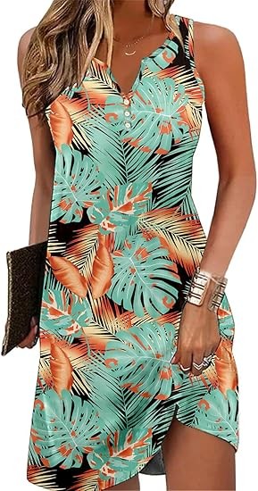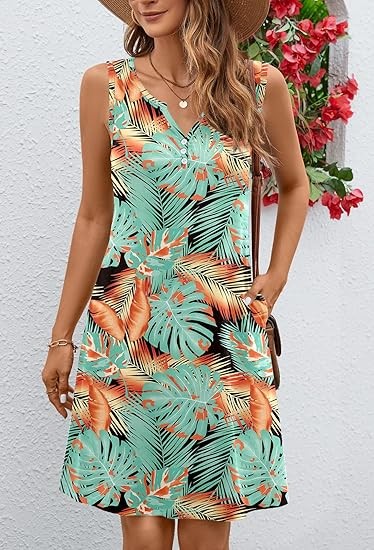 Material: 95%Polyester,5%Spandex.Skin-Friendly,Breathable,Nice and more of a soft stretchy feel.Not see through,Not shrinkage,Lightweight,Ideal for summer weather. Features:This dress features a V-neck,Sleeveless,Floral Print design.The A-line silhouette flatters all body shapes.Ideal for vacation or everyday wear,Is a must-have for the fashion-forward woman. Occasion: Whether you're heading to the beach,A dinner out,Or a casual day of shopping,This dress is versatile enough to suit any occasion.Pair it with sandals for a laid-back look or dress it up with heels and accessories for a more polished ensemble. Attention:Machine or hand wash with cold water/Hang or line dry/No bleach. Please forgive the slight color difference caused by different computer and mobile phone monitor settings.