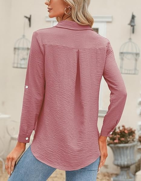 Womens Button Down Shirts V Neck Rolled Up Long Sleeve Tops Elegant Dressy Blouses Business Casual Outfits
