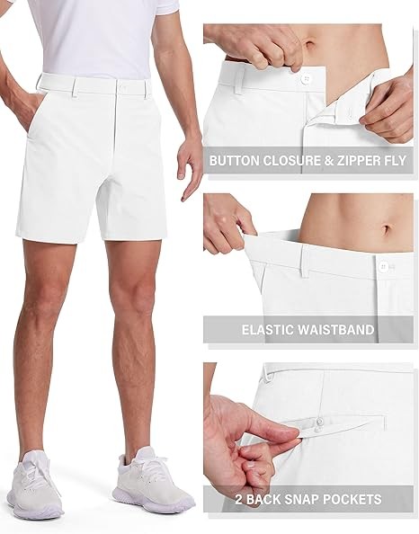 Lightweight & Anti-Wrinkle Fabric: Made from performance fabric, men's golf shorts are lightweight and breathable with 4-way stretch, dry fit, UPF 50+, anti-wrinkle and easy to care for, keeping you dry and comfortable all day long. 5 Practical Pockets: Golf shorts men 7 inch inseam have 1 side hidden zippered pocket on your right side, store your phone,keys or cards securely. 2 convenient deep hand pockets and 2 back snap pockets to storage your values, golf essentials and other small items. Closure Type: Mens dress shorts with elasticized waistband and 1.7" belt loops designed to enhance the fit of the product. Zipper fly and button closure are durable for any occasion.
