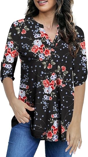 【SIZE】Womens plus size tops, plus size blouses for women, 6 US sizes(M,L,1X,2X,3X,4X) 【FEATURES】Floral Print, 3/4 sleeve, fashion V neck design,plus size tops for women, swing hem drapes nicely and hides your belly & hips well, adds femininity 【PAIRS WITH】Plus size 3/4 sleeve tops for women, plus size blouse, match this plus tunics with jeans, leggings in Spring, Summer and Fall 【OCCASIONS】 Dressy casual business fashion comfy loose fitting womens plus size blouses, Suitable for Office/ Dating/ Formal Occasions/ Daily Casual Wear/ Workwear, etc