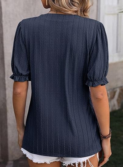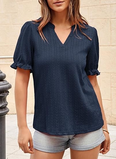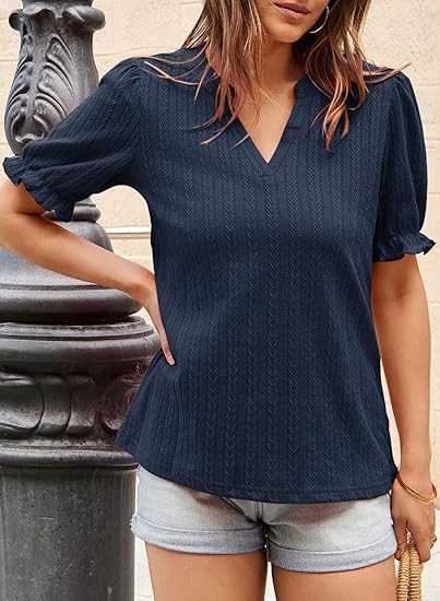 Womens Summer Short Puff Sleeves Blouses Shirts V Neck Cute Solid Knit Textured Casual Regular Fit Tops