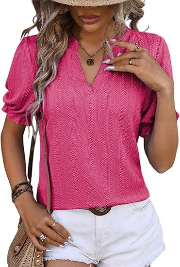 Womens Summer Short Puff Sleeves Blouses Shirts V Neck Cute Solid Knit Textured Casual Regular Fit Tops