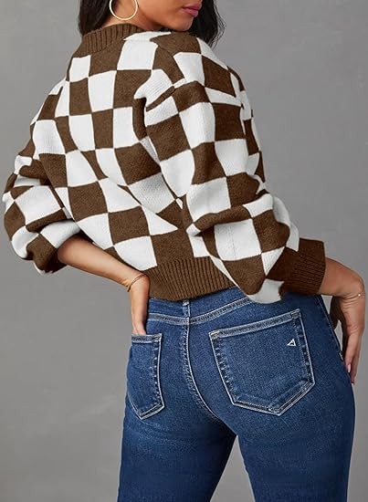 Feature: V Neck, Button Down, Long Sleeve, Cropped Fit, Plaid/Checkered Design, Cable Knit Cardigan