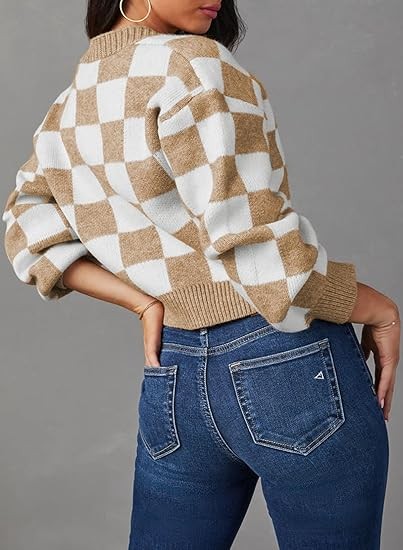 Womens Checkered V Neck Button Down Long Sleeve Cable Knit Cropped Cardigan Sweaters Tops